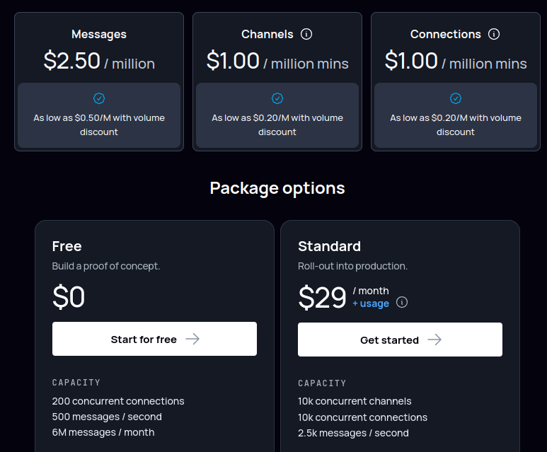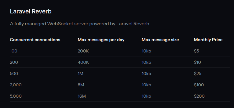 Example scenario: 5,000 concurrent users online for 6 hours a month and 100 messages per user per month, the usage works out to about $33.30/month. By comparison, Laravel Cloud Reverb’s published 5,000 concurrent connections tier is $200/month.