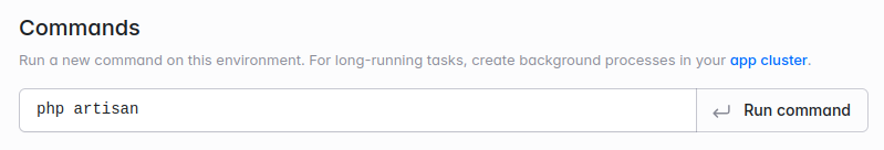 There's no interactive shell, and no ability to connect to a running instance of the service in another manner. All you get is a single text box where you can pass a command (with php artisan prefilled).